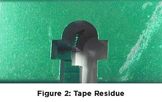 - Tape—Although recommendations to the contrary, clear tape sometimes is used to affix a label directly to a part. However, tape or residue from the tape adhesive can be left on the part. Both need to be removed thoroughly so they don’t act like a mask (see Figure 2).